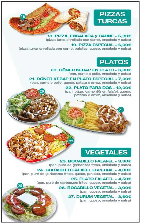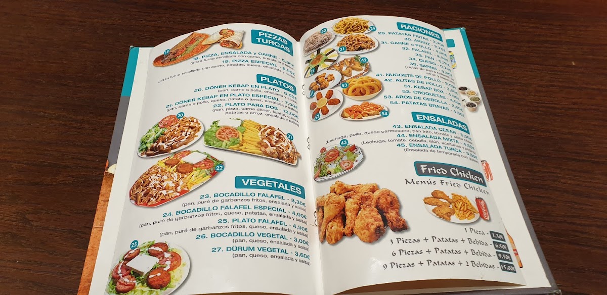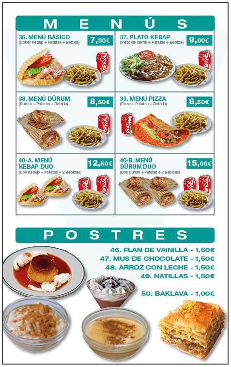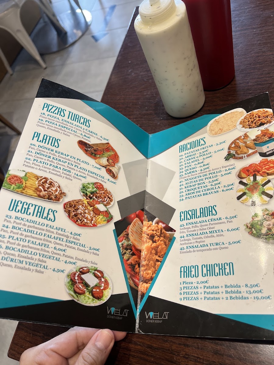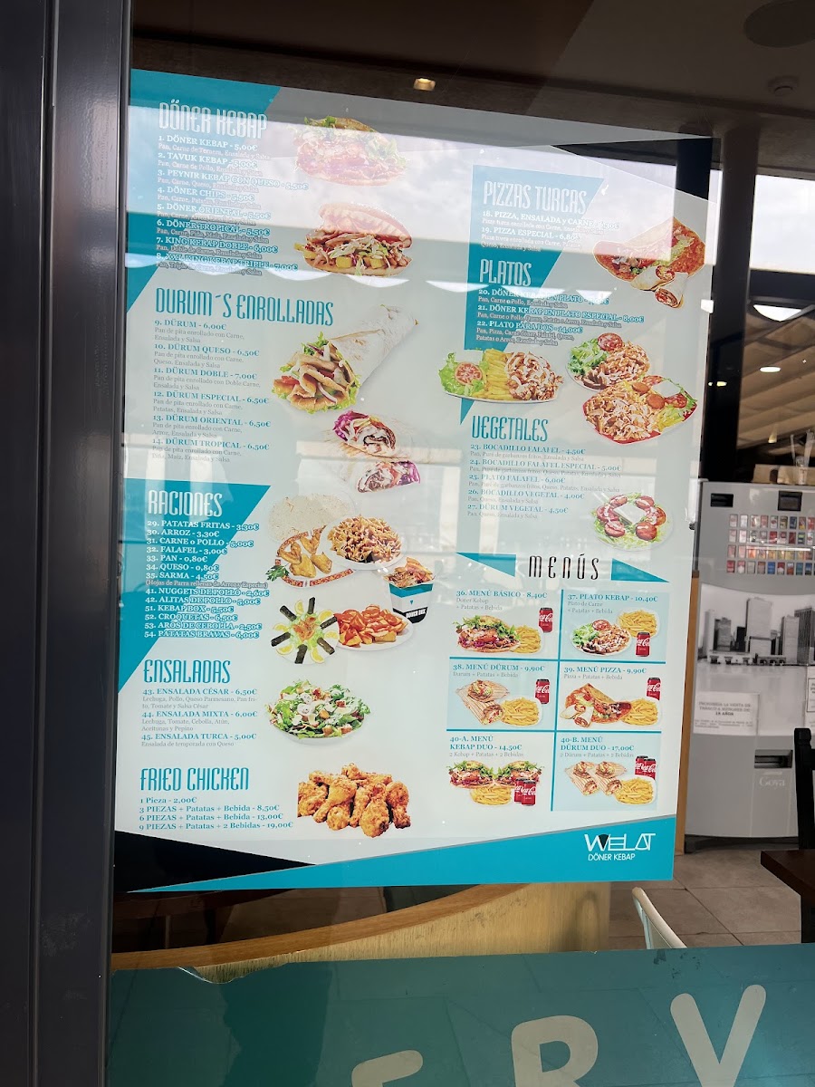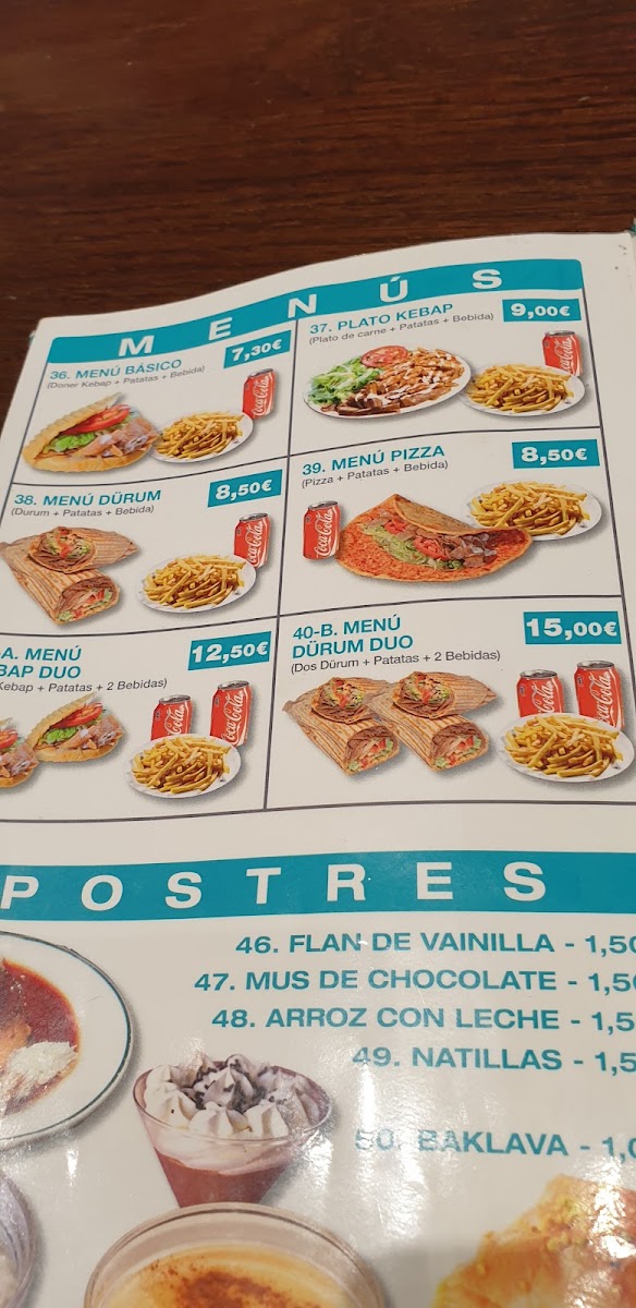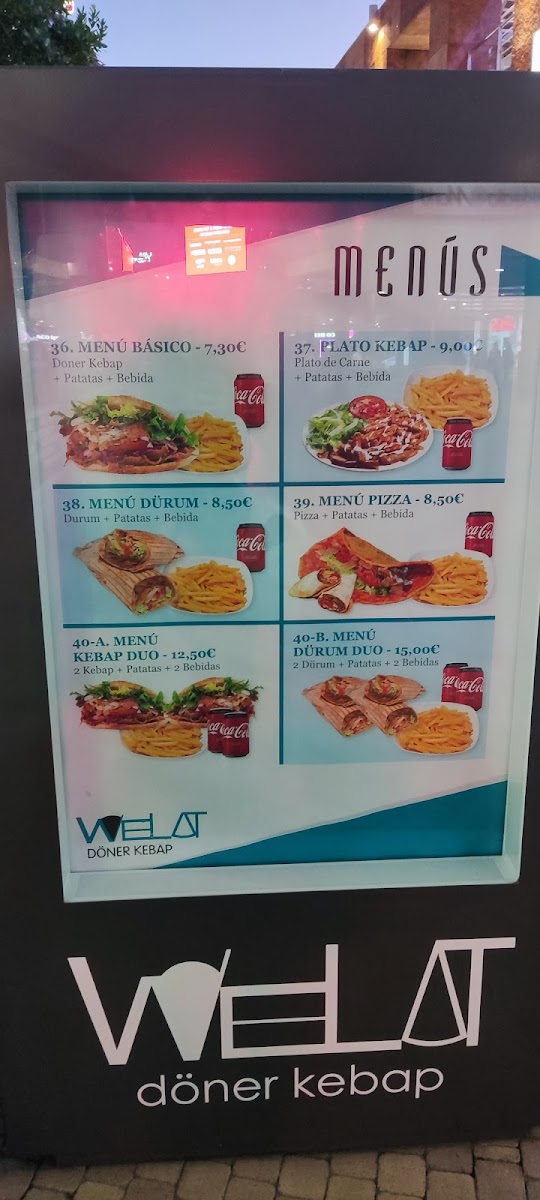 The menu at Restaurante WELAT DONER KEBAP features a variety of kebab dishes with options including beef and mixed meat selections. Offerings include plates served with bread or durum wraps, alongside accompaniments such as salads and French fries. The menu also provides vegan options that incorporate fresh cheese. Condiments like sauces and napkins are available to complement the meal.
