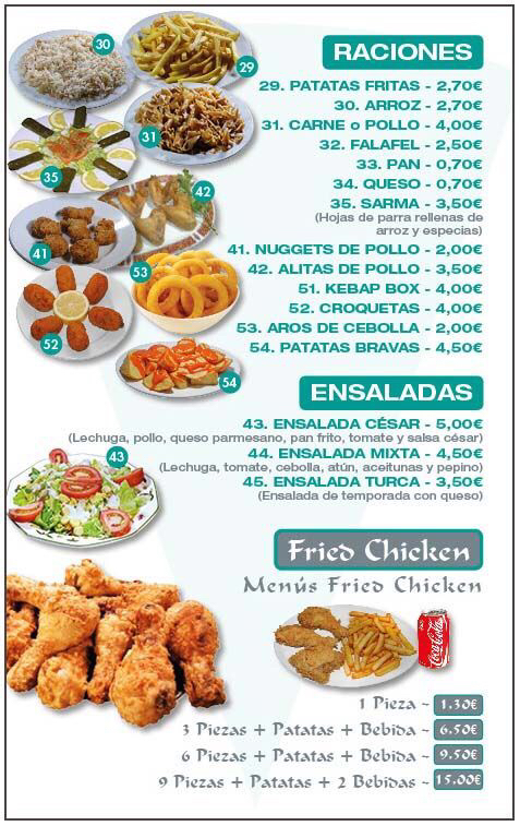 The types of food available are primarily suitable for casual dining occasions such as lunch or dinner. The menu is structured around main kebab dishes with side items and condiments, catering to customers seeking a quick, yet complete meal.